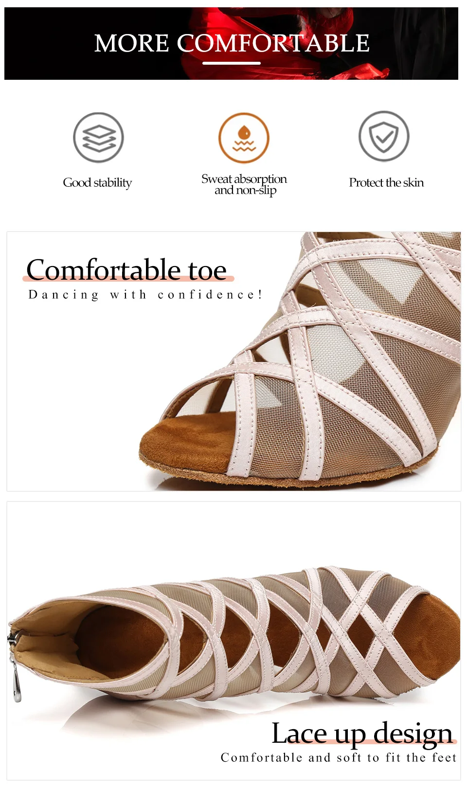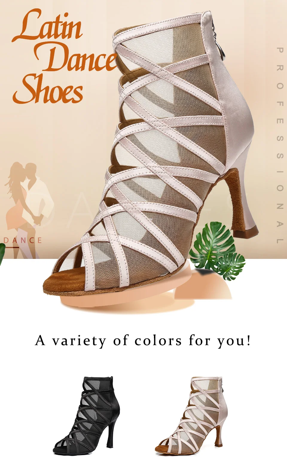 Design: classic open-toe dance boots design, combination of mesh and silk satin, novel and unique. The zipper is more convenience. There are two colors to be chosen, skin color and black. This is the best choice for professional dancers.