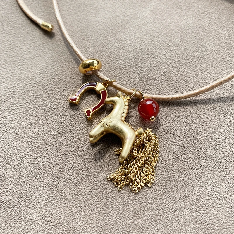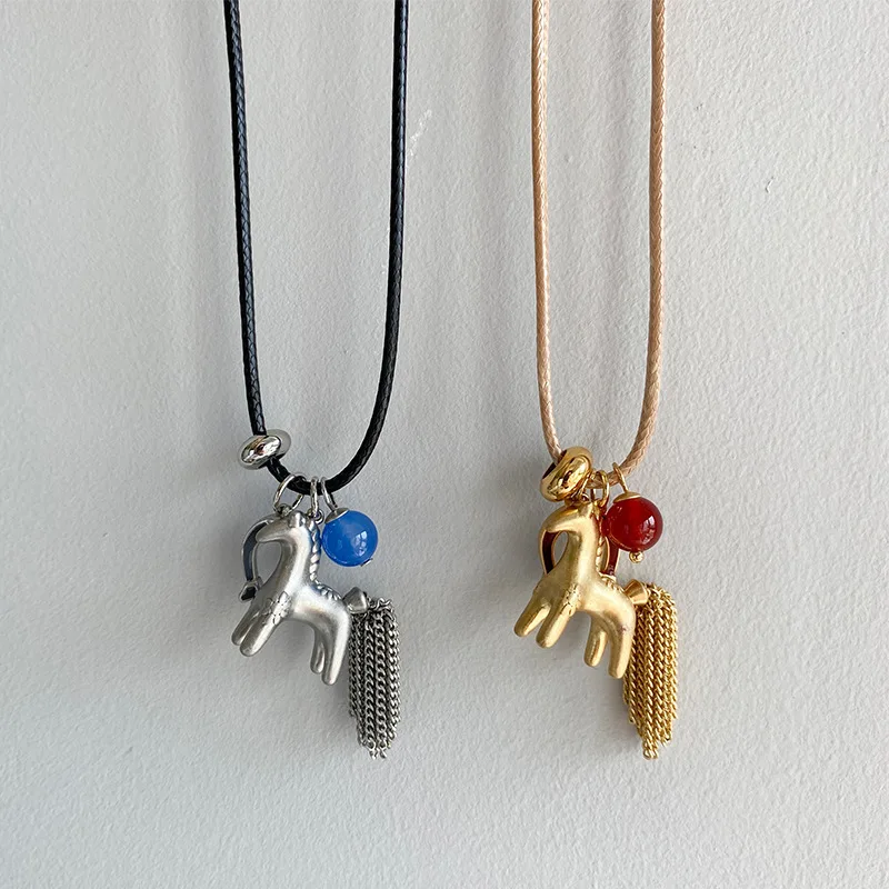 LATS Metallic Cartoon Horse Multi Tassel Beads Pendant Necklaces for Women Adjustable Long Wax Rope Chain Chokers Funny Jewelry