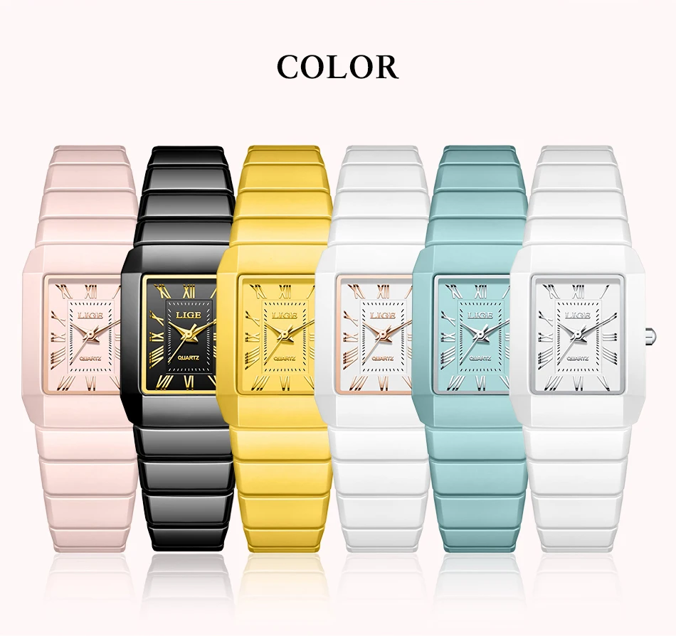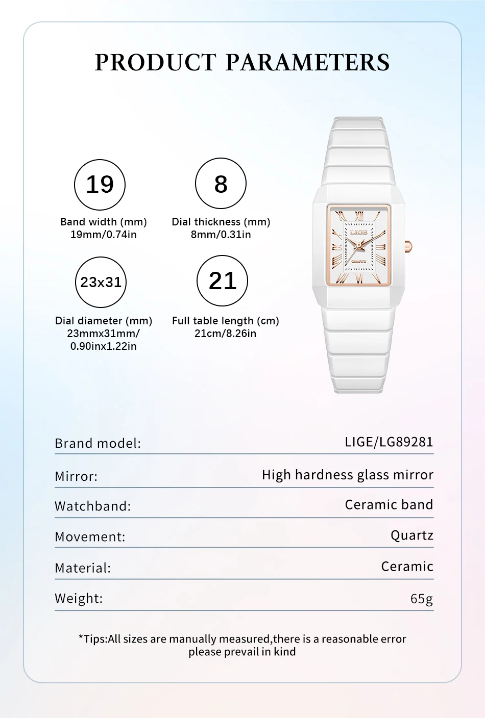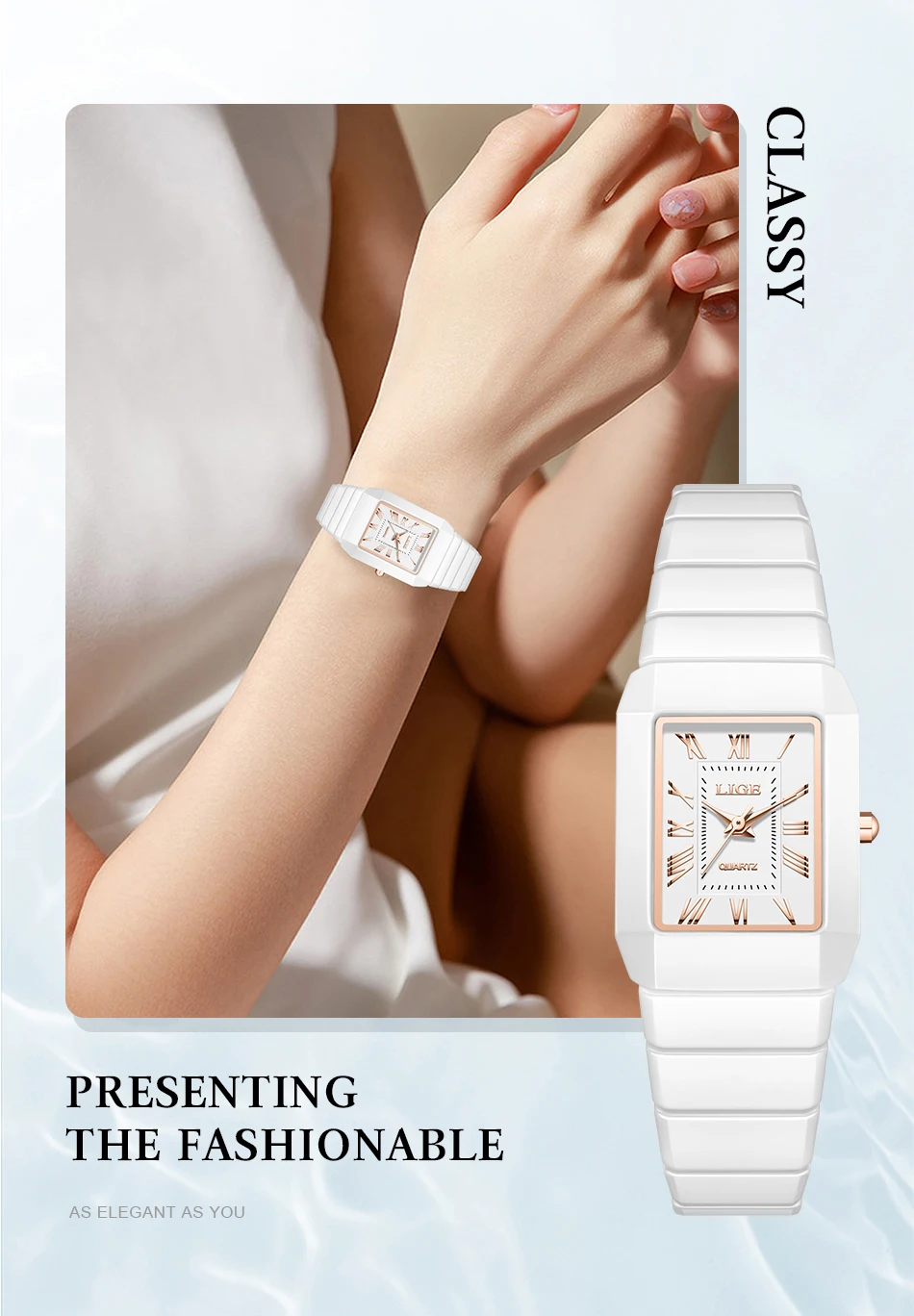 LIGE Luxury Fashion Quartz Woman Watch Square Elegant High Quality Ceramic Belt Wristwatch Waterproof Watches Gift for Women+Box