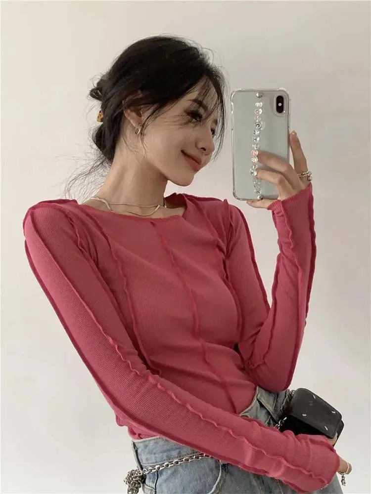 Long Sleeve T-shirts Women Spring Solid O-Neck Elegant Bright Line Decoration Slim Casual Soft High Quality Ladies Clothing Tees