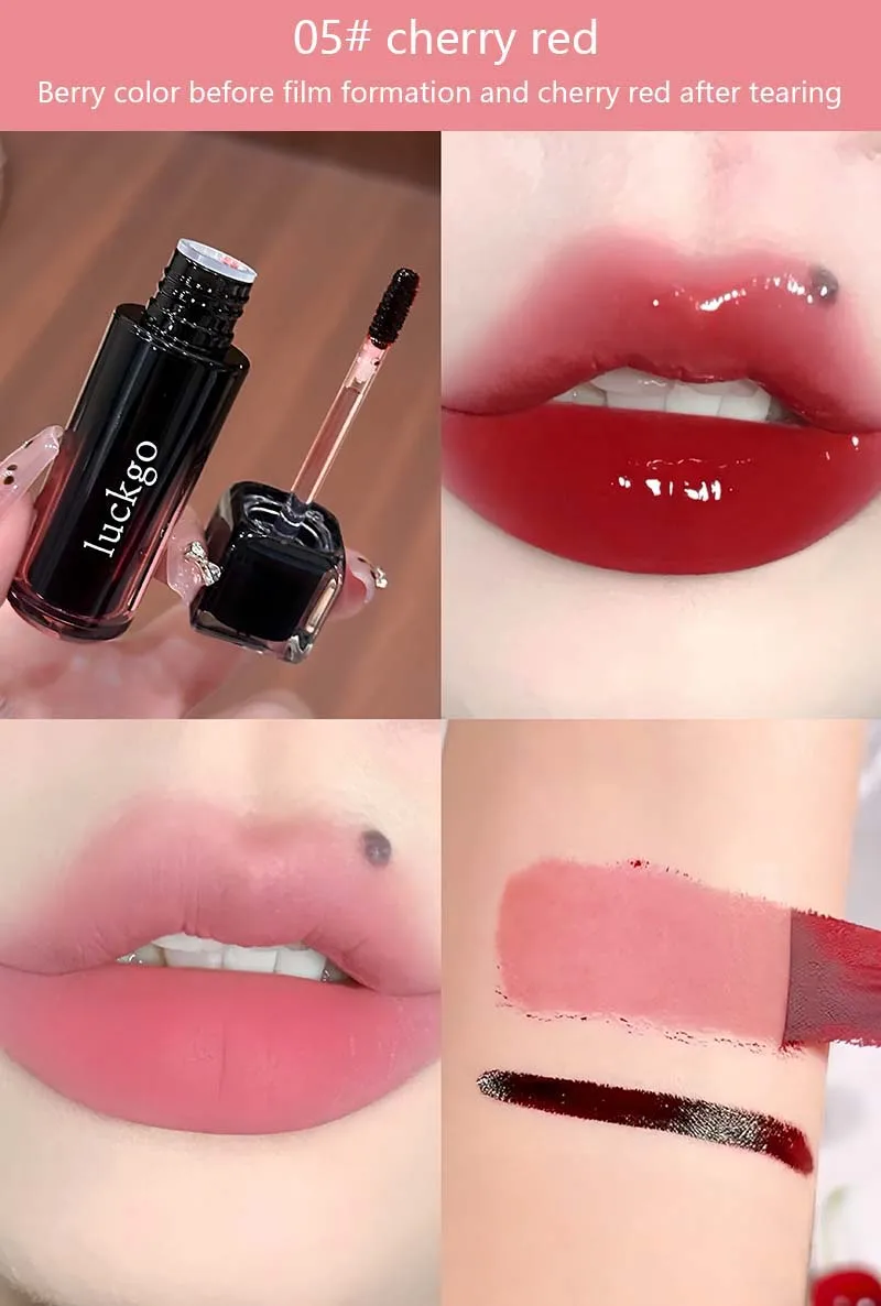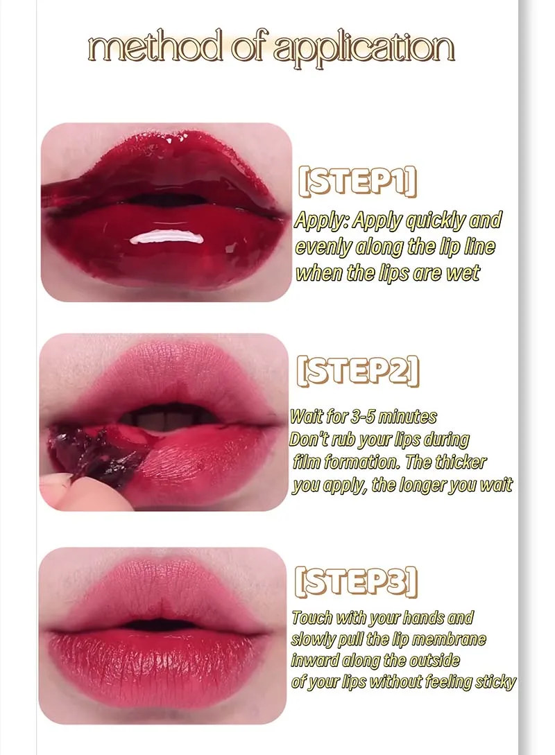 Wow, I couldn't handle this tint right away 😅 I didn't immediately notice that it's a tint that comes off with a film. The tint is very thick and difficult to apply on lips. The film didn't come off completely from the lips, and what was left couldn't be wiped off; it looked like blood had dried or something like that. The shade on the lips turns out beautiful and even. Delivery to Kyiv took more than a month. My recommendations for purchase 👌
