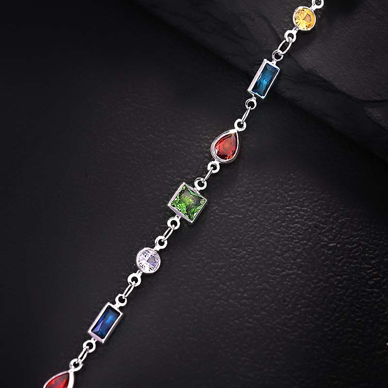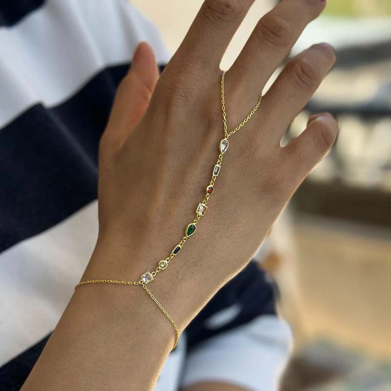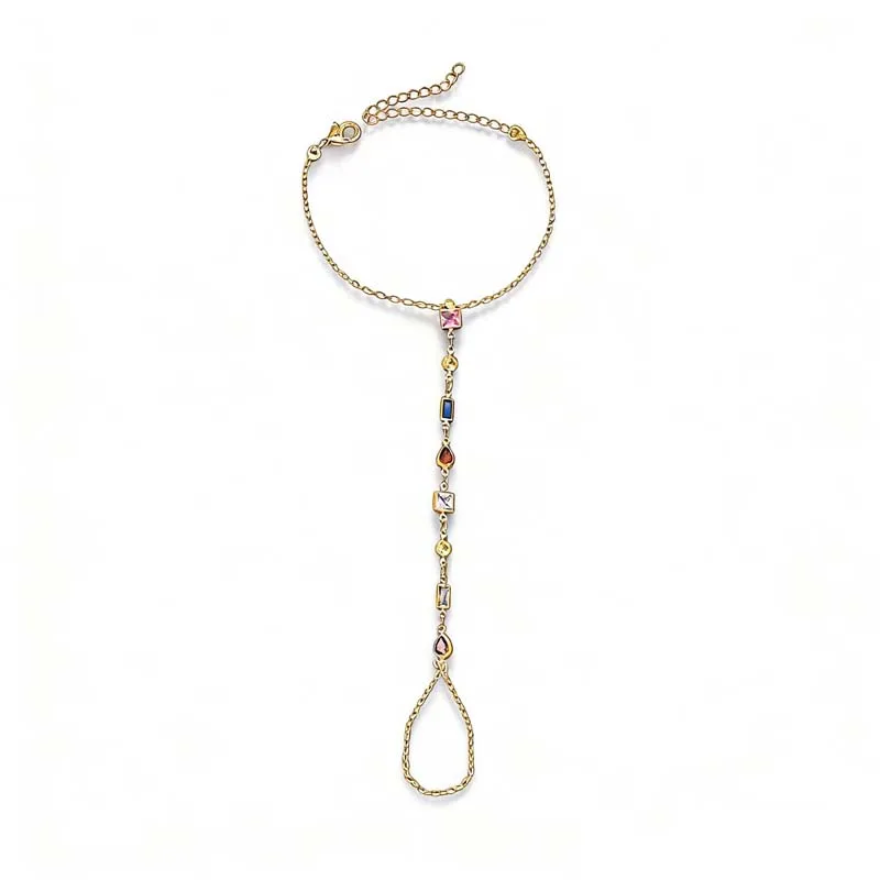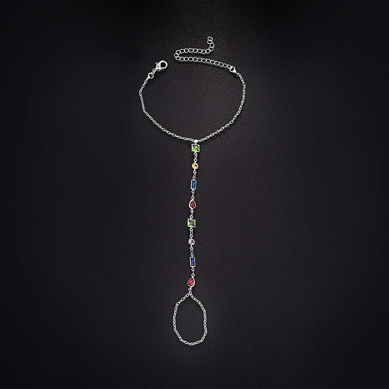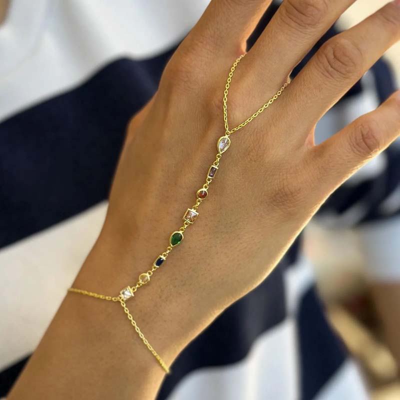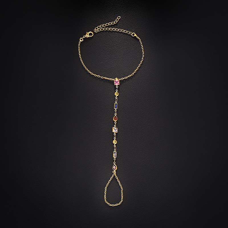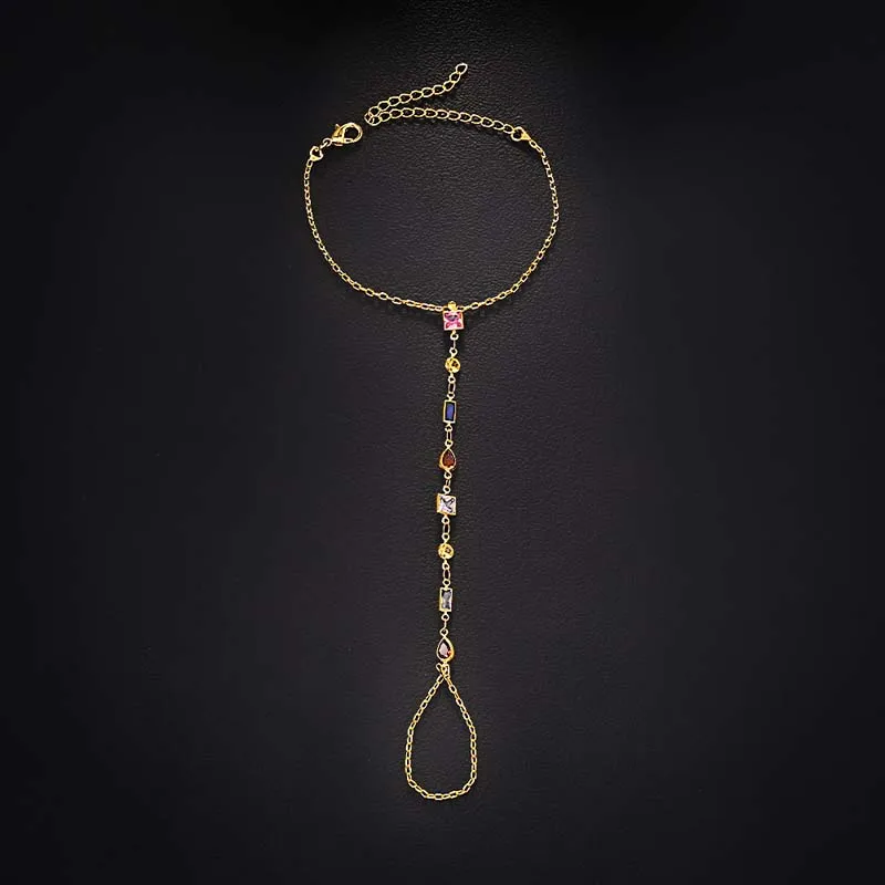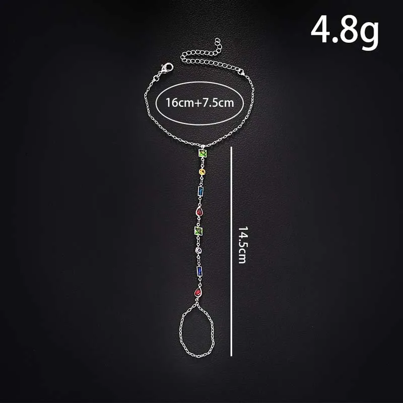 New Colorful Crystal Zircon Link Chain Connected Finger Ring Bracelet for Women Boho Gold Color Hand Chain Bracelet Jewelry