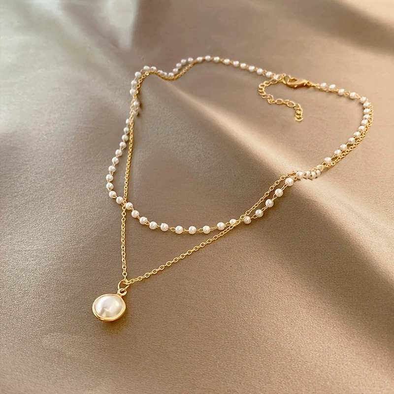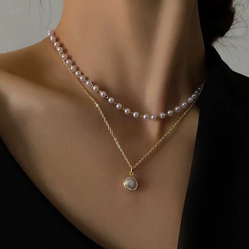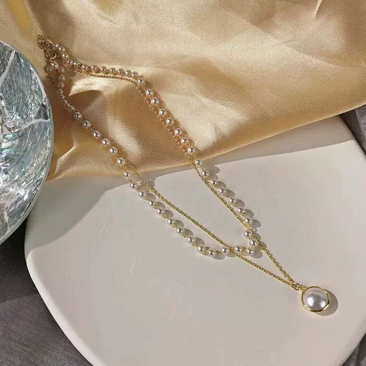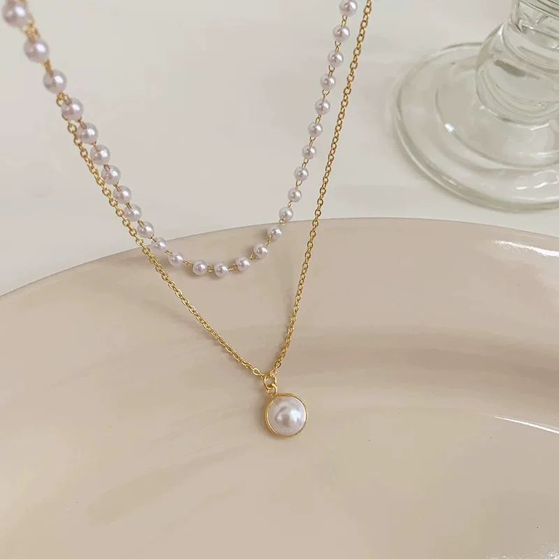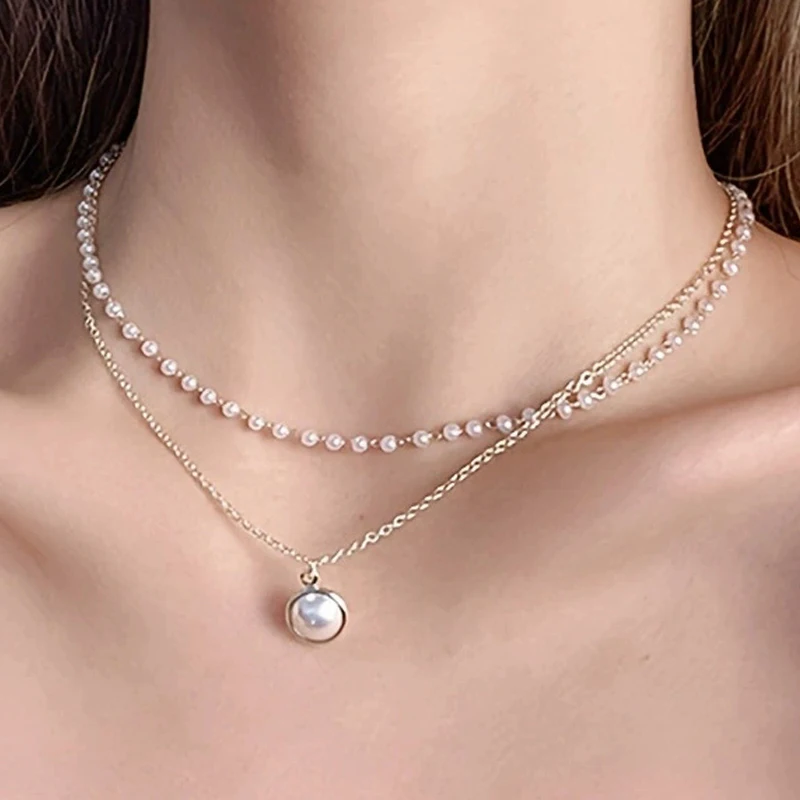 New Fashion Imitation Pearl Choker Necklace Cute Double Layer Chain Round Pendant Necklaces For Women Jewelry Girl Gift