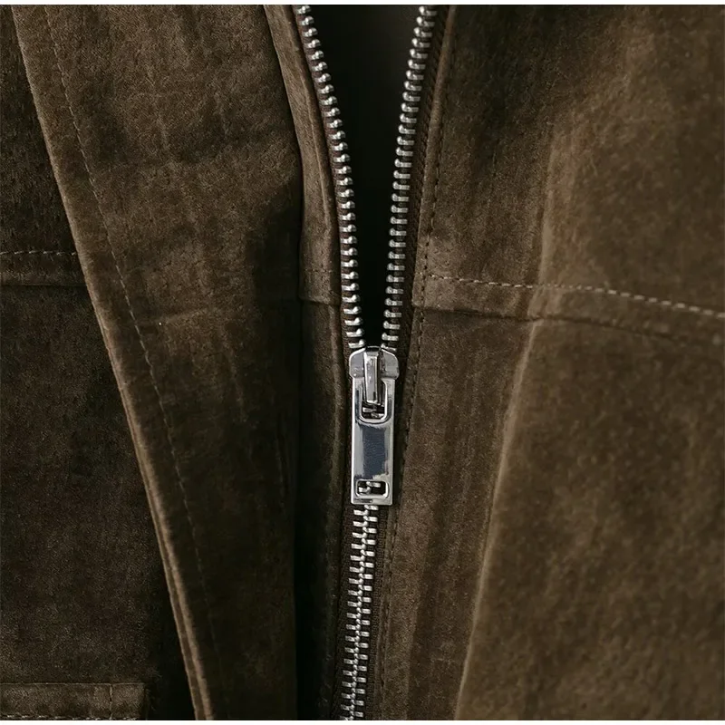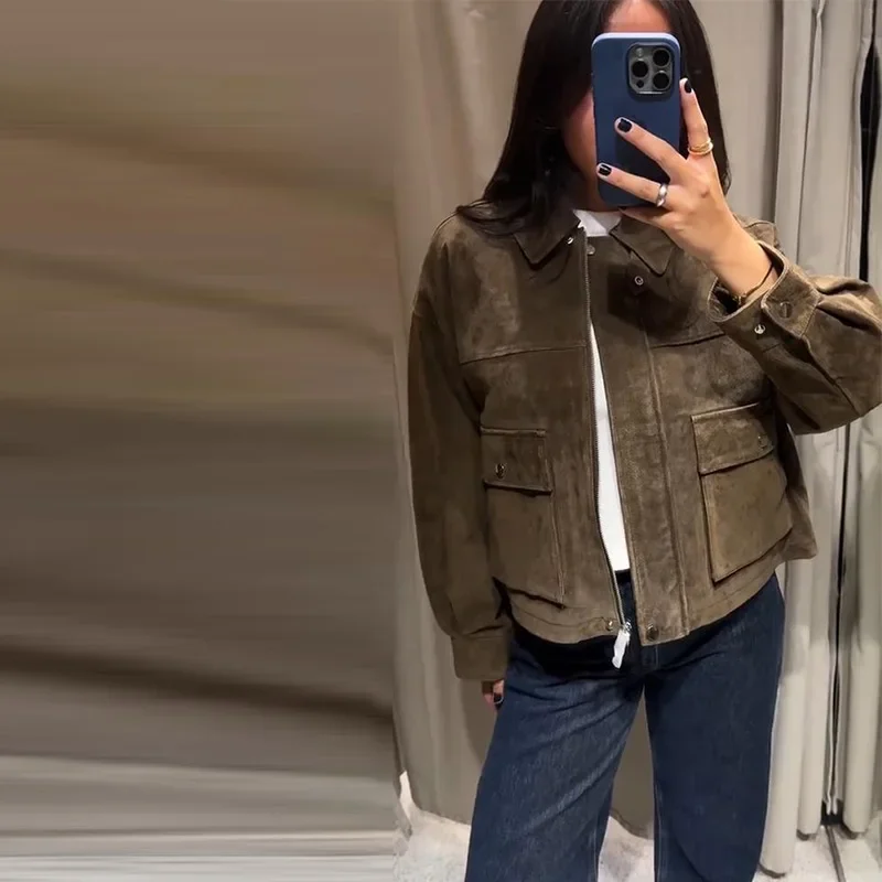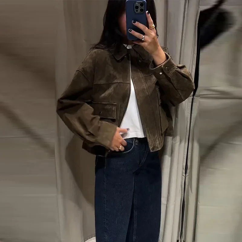 New Women’s Brown Suede Jackets Lapel Zipper Button Long Sleeve Pockets Female Coats 2025 Autumn Lady Vintage Outerwears
