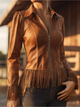 Elegant Long Sleeve Tassel Shirts for Women PU Lapel Solid Color Fringed Hem Autumn Outerwear Regular Slimming Zipper Jacket