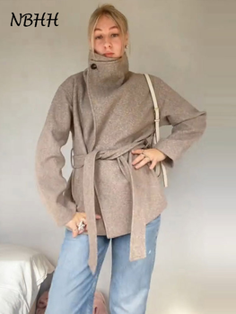 Elegant Stand Collar Lace Up Woolen Coat Women Loose Long Sleeve Button Solid Jacket Female 2025 Autumn Winter New Lady Outwear