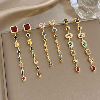 Vintage Geometric Colorful Zircon Long Pendant Earrings for Women Gold Plated Stainless Steel Drop Earrings Jewelry Gifts