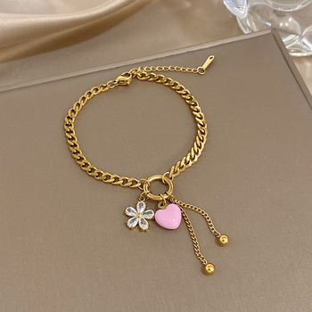 Elegant Pink Heart Zircon Flower Charms Bracelet Chic Gold Plated Stainless Steel Thick Chain Bracelets Valentine’s Day Jewelry