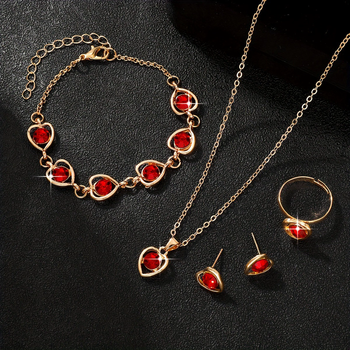 Fashion Women’s Jewelry Romantic Heart with Red Rhinestones Pendant Necklace Earrings Bracelet Ring Elegant Jewelry Set Gifts
