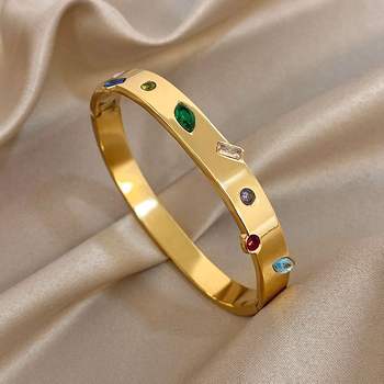 Irregular Colorful Zircon Cuff Bangle for Women Stylish Gold Plated Stainless Steel Smooth Wrist Bracelets Waterproof Jewelry