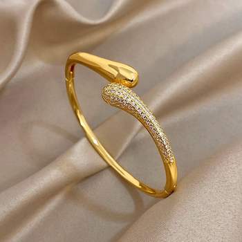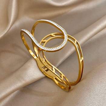 Luxury Micro Inlaid Zircon Cuff Bangle Bracelets for Women Trendy Glossy Gold Color Stainless Steel Bracelet Party Jewelry