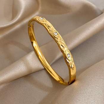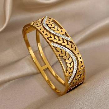 Exquisite Leaves Rhinestone Cuff Bangle Bracelet for Women Glossy Gold Plated Stainless Steel Wristband Bracelets Jewelry Gifts