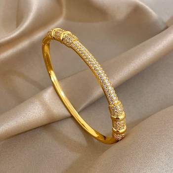 Glossy Bamboo Rhinestone Circle Cuff Bangle Bracelets for Women Trendy Gold Plated Copper Wristband Bracelet Party Jewelry Gifts
