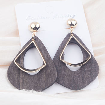 Trendy Personality Water Droplet Dangle Earrings for Women Two-Layer Twist Metal Wooden Drop Earrings Hollow Geometry Jewelry