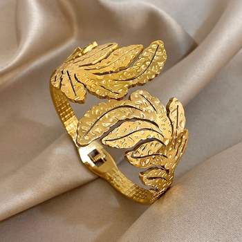 Irregular Carved Textured Leaves Feather Cuff Bangle Exaggerated Gold Plated Stainless Steel Wide Bracelets Waterproof Jewelry