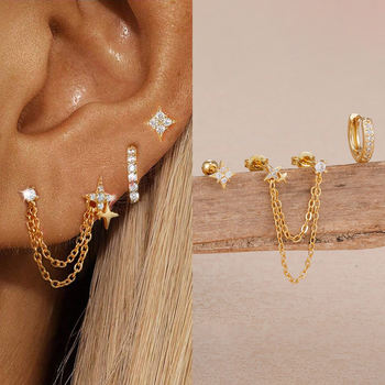 Vintage Zircon Crown Stud Earring Set Stainless Steel Chain Helix Cartilage Earrings for Women 14K Gold Plated Piercing Jewelry