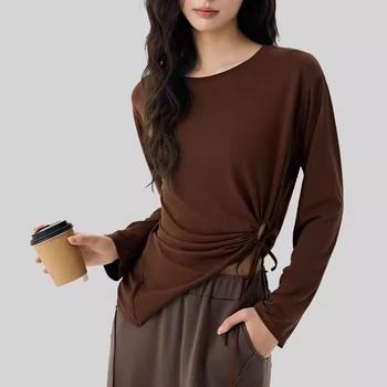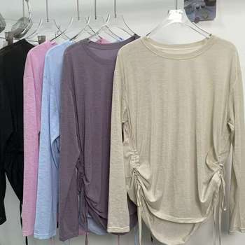 Slub Yarn Sports T-shirt Gym Fitness Drawstring Pleated Blouse Training Pilates Professional Fitness Clothing Yoga Long Sleeves