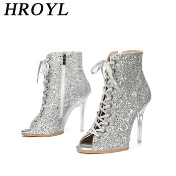 HROYL Silver Shiny Latin Dance Shoes Women Mesh Jazz Salsa Dance Boots High-top Fish Mouth Professional Dancing Heels Boots
