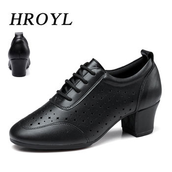 HROYL New Fashion Leather Perforated Dance Shoes Square Dance Shoes Soft-soled Ballroom Dance Shoes Mid-heel Latin Dance Shoes