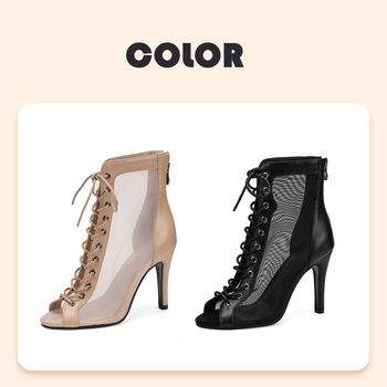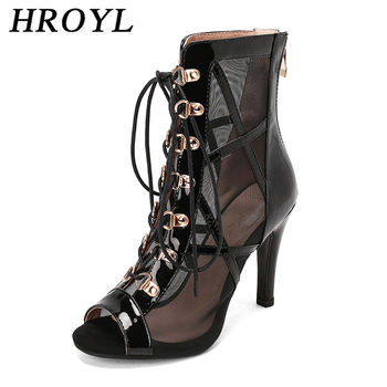 HROYL Mesh Jazz Dance Short Boots Lace-up Jazz Latin Tango Dance High Heels Plus Size Sandals Fish Mouth Dance Shoes Women