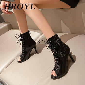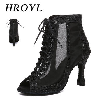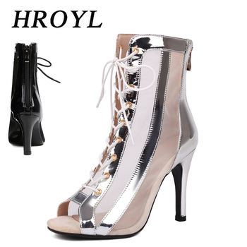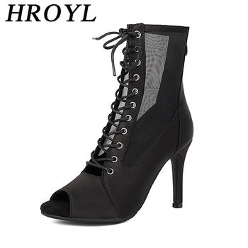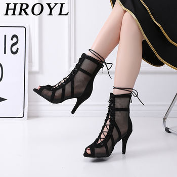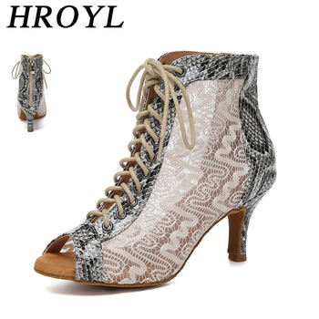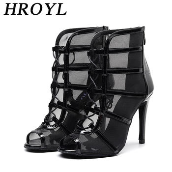 HROYL New Latin Dance Shoes Woman Mesh Dance Shoes Heels Jazz Tango Dance Short Boots Fish Mouth Sexy Lace-up High Heels Women