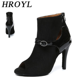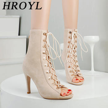 HROYL High Heel Dance Shoes Woman Beige Black Latin Dance Booties Women Open Toe Lace Up Stiletto Boots for Girls Suede Sole