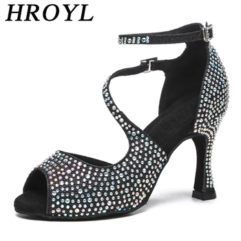 HROYL Rhinestone Dance Shoes Women Tango Salsa Shiny Latin Jazz Dancing Boots Heels Soft Sole Woman Sandals Ladies Wedding Shoes
