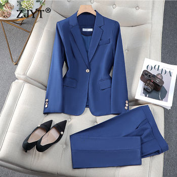 ZJYT Elegant Women’s Trousers Suit Blazer and Pants Sets Two Pieces Outfit Blue Formal Office Lady Work Wear Plus Size Suits