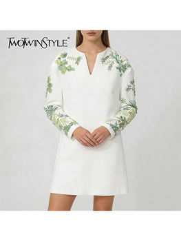 TWOTWINSTYLE Solid Loose Spliced Appliques Elegant Dress for Women V Neck Long Sleeves Minimalist Mini Dresses Female Clothing