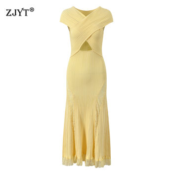 ZJYT Summer Fashion Women Cross Hollow Out Midi Knitting Sweater Dresses Yellow VNeck Lace Patchwork Sexy Party Sleeveless Dress