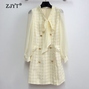 ZJYT Spring New Elegant Long Sleeve Dress Woman 2026 Fashion Bow Collar Tweed Patchwork Casual Day Dresses Female Vestidos Beige