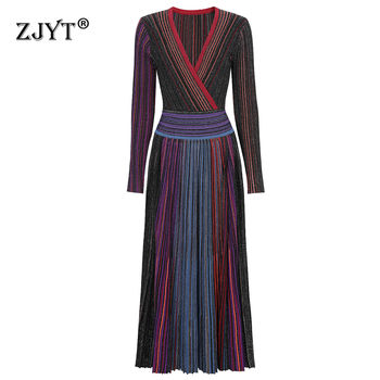 ZJYT New Elegant Women’s Rainbow Striped Knitting Dresses Sweaters Autumn Winter Long Sleeve V Neck Pleated Vintage Midi Dress