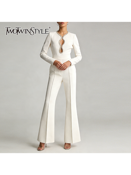 TWOTWINSTYLE Slimming Hollow Out Spliced Bead Minimalist Jumpsuit for Women Round Neck Long Sleeves High Waist Jumpsuits Female