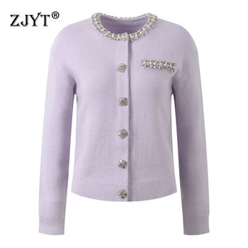 ZJYT Autumn Winter Luxury Beading Knitted Cardigans Women Long Sleeve Knitting Sweater Tops Knitwears Jersey Mujer Casual Purple