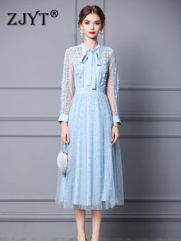 ZJYT Elegant Bow Collar Lace Patchwork Midi Mesh Dresses for Women Party 2023 Designer Long Sleeve Sexy Vestidos De Fiesta Blue