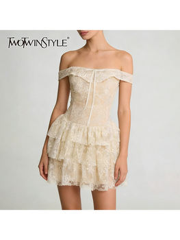 TWOTWINSTYLE Elegant Spliced Embroidery Slimming Mini Dress for Women Slash Neck Short Sleeves Patchwork Ruffles Dresses Female