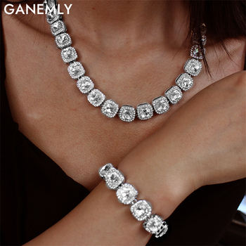 GANEMLY Hip-Hop Exaggeration Square Sparkling Zirconia Necklace Bracelet Set For Women Men Waterproof Neck Chain Bangles Jewelry