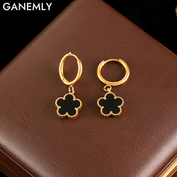 GANEMLY 316L Stainless Steel Black Five Leaf Clover Flower Stud Earrings For Women New Trendy Waterproof Ear Jewelry Girls Gift