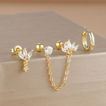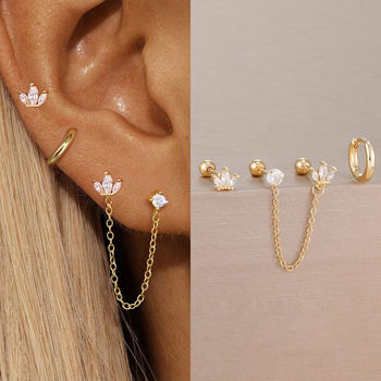 Vintage Zircon Crown Stud Earring Set Stainless Steel Chain Helix Cartilage Earrings for Women 14K Gold Plated Piercing Jewelry