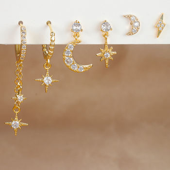 6PCS Fashion Cubic Zirconia Chain Star Moon Hoop Earring Set for Women Stainless Steel Pendant Cartilage Piercing Jewelry