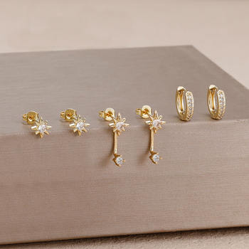 3PCS Stainless Steel Eight-Pointed Star Moon Zircon Hoop Earrings Set For Women Trendy 14K Gold Plated Ear Stud Girls Jewelry