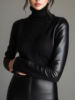 PU Leather Patchwork Knit High Neck Sweater Women’s Long Sleeve Pullovers Basic Female PU Sleeve Patchwork Faux Leather Sweaters