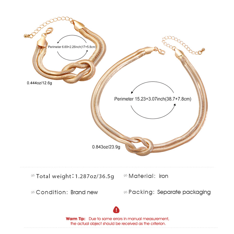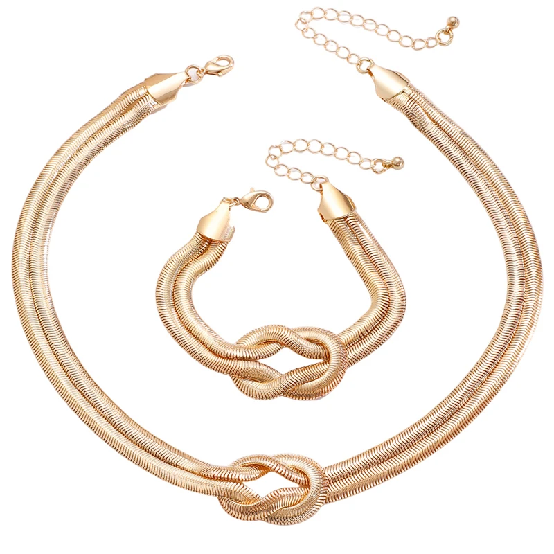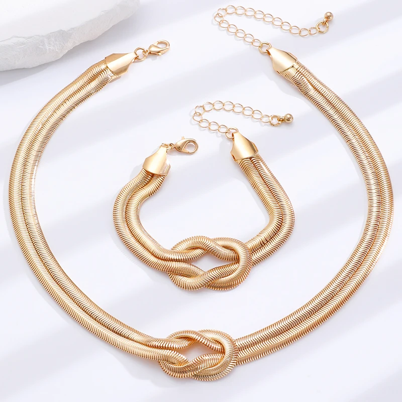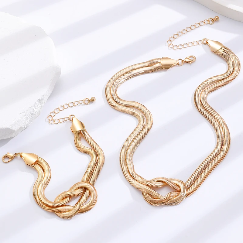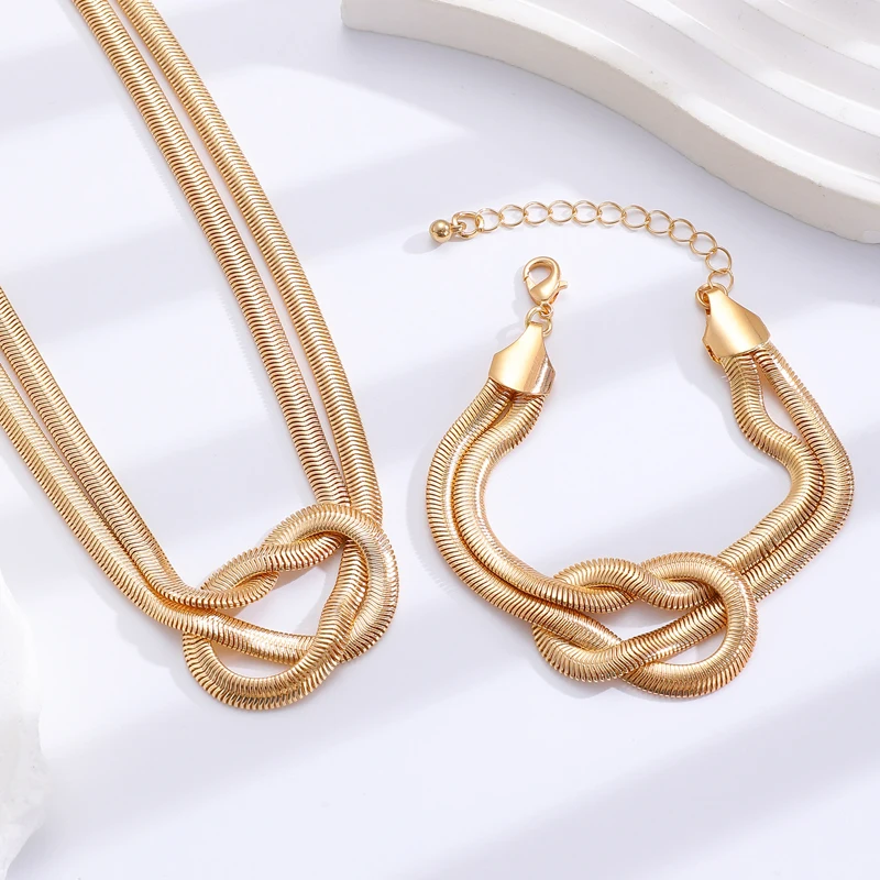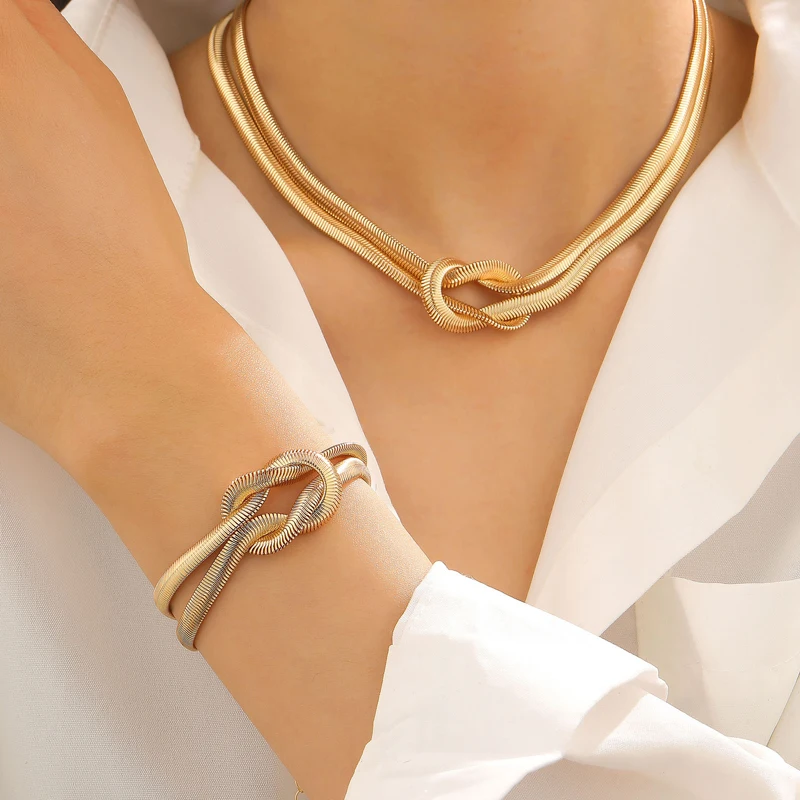Punk Metal Knot Double Layered Necklace Bracelet Set for Women Hip-Hop Gold Color Wrapped Adjustable Clavicle Chain Jewelry Sets