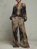 Retro Pattern Printed 2 Pieces Set for Woman Sexy V Neck Top Blouses Elegant Outfit 2026 Spring Fall Wide Leg Trousers Suit