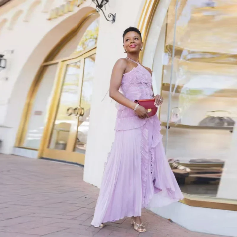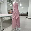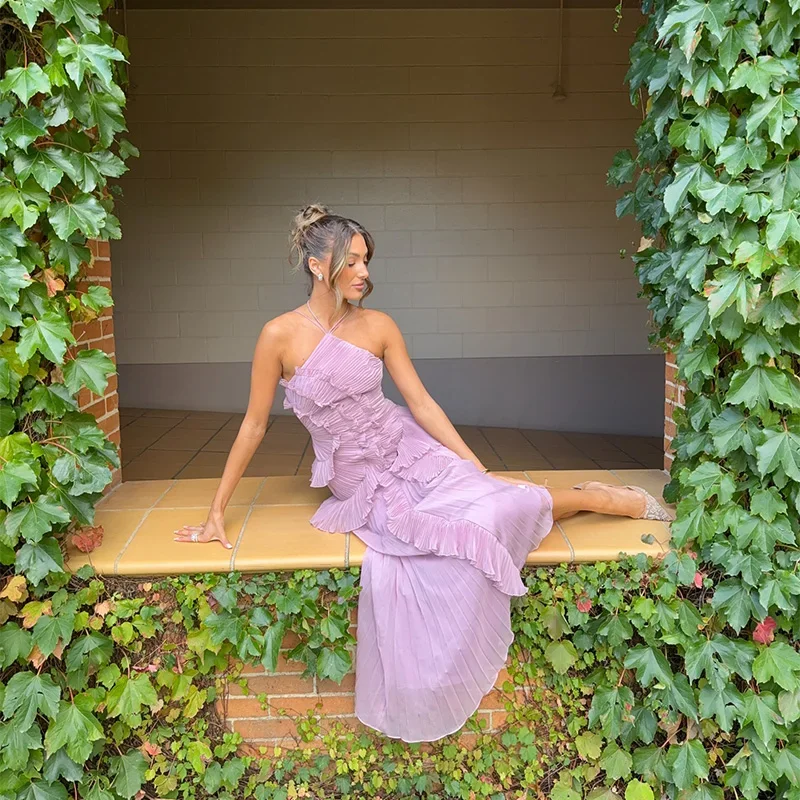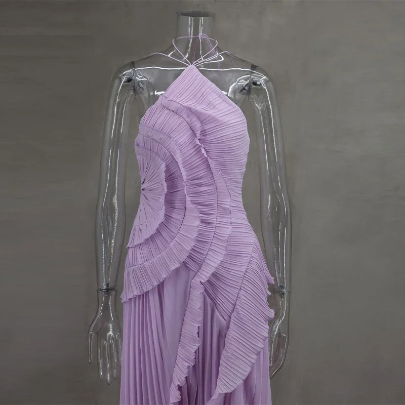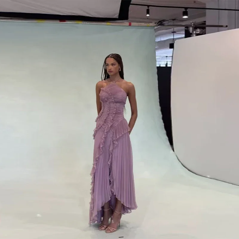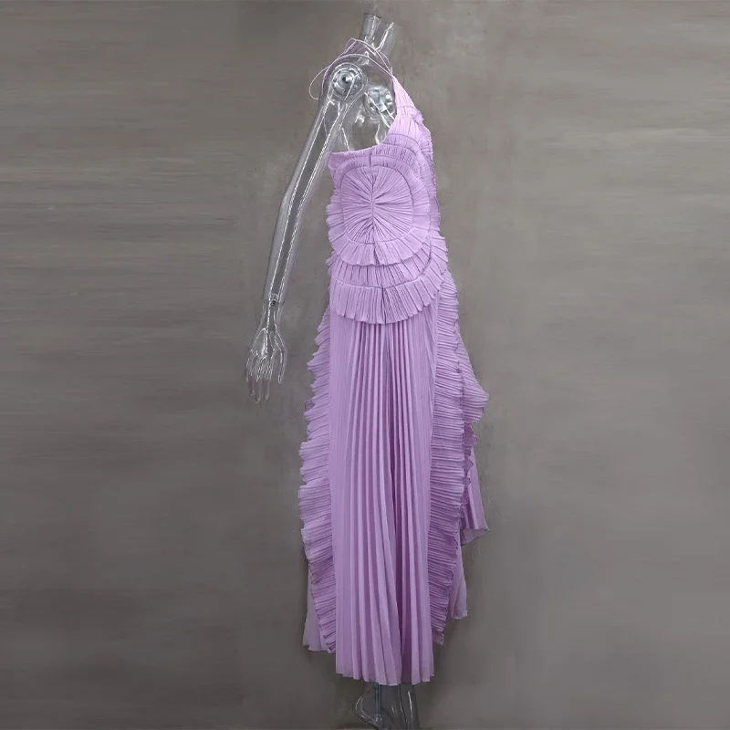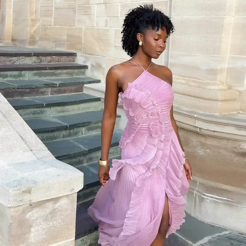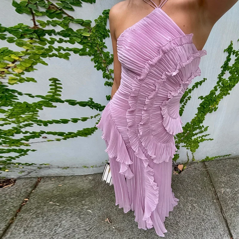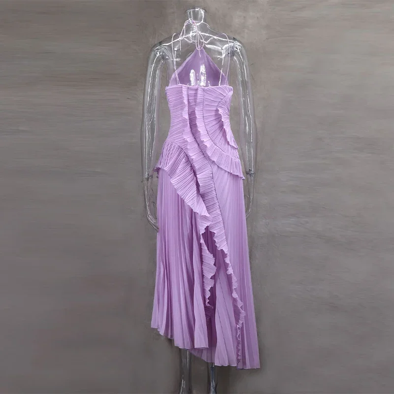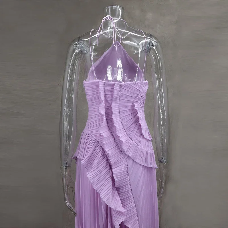 Ruffle Halter Women Dresses Pleated Solid Lady Long Dress Elegant Summer Hip Package Split Backless Female Vestidos 2025