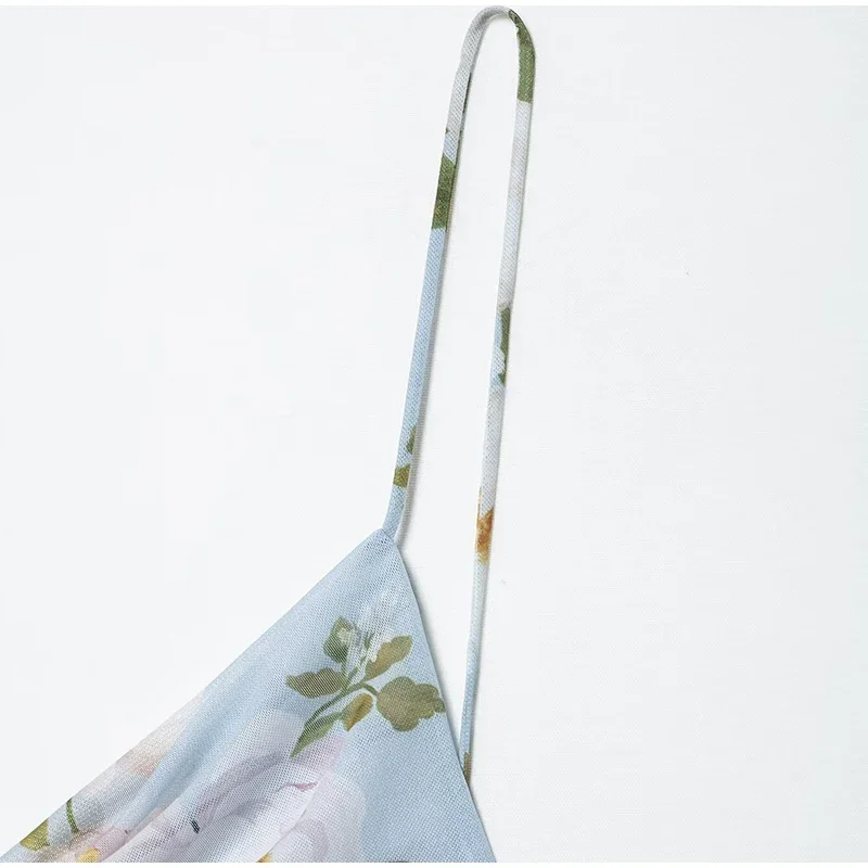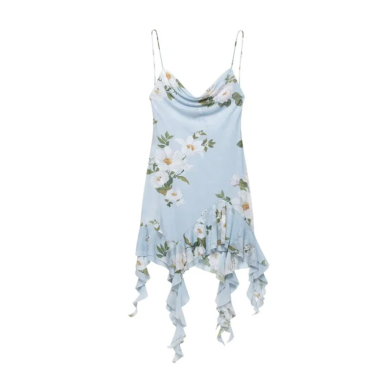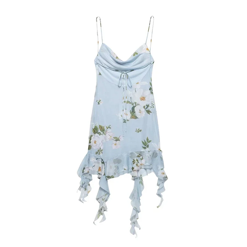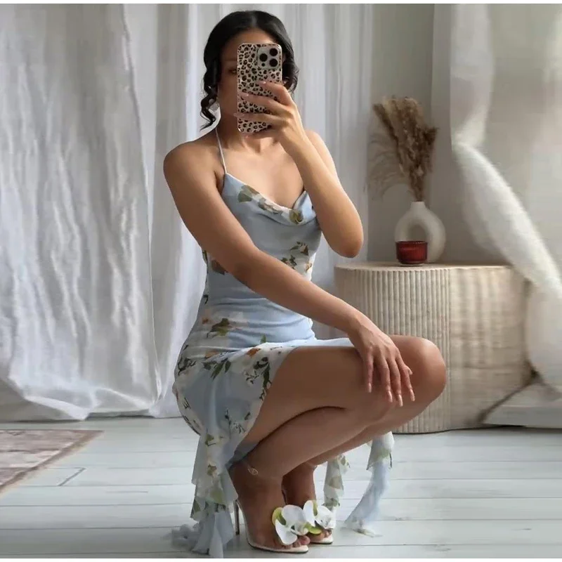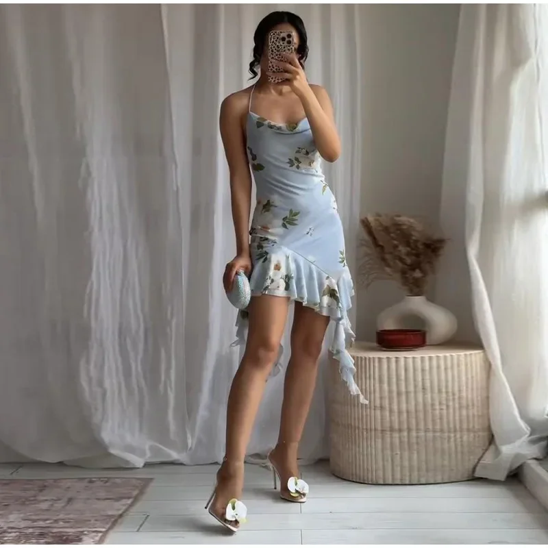 Ruffled Floral Printed Sling Mini Dress Women Spaghetti Strap Sleeveless Backless Short Dress Lady Summer Holiday Vestidos