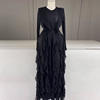 Ruffles Pleated Maxi Dress For Women Round Neck Long Sleeves High Waist Satin Dresses Lace-up Fashion Party New Clothing