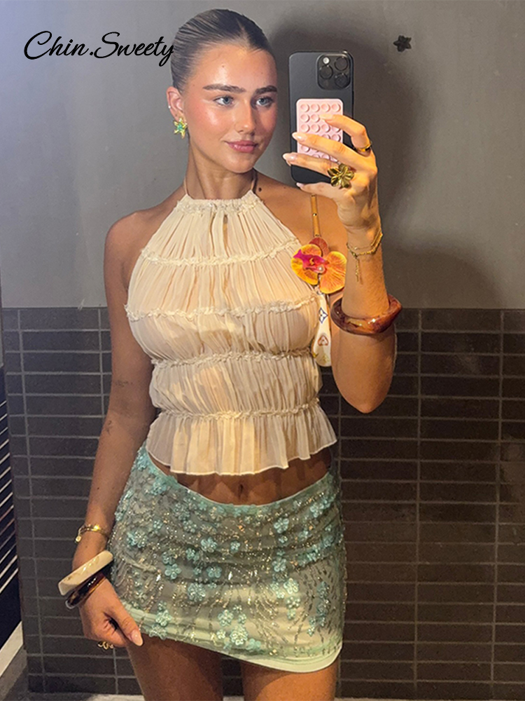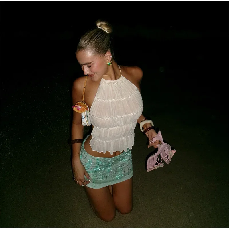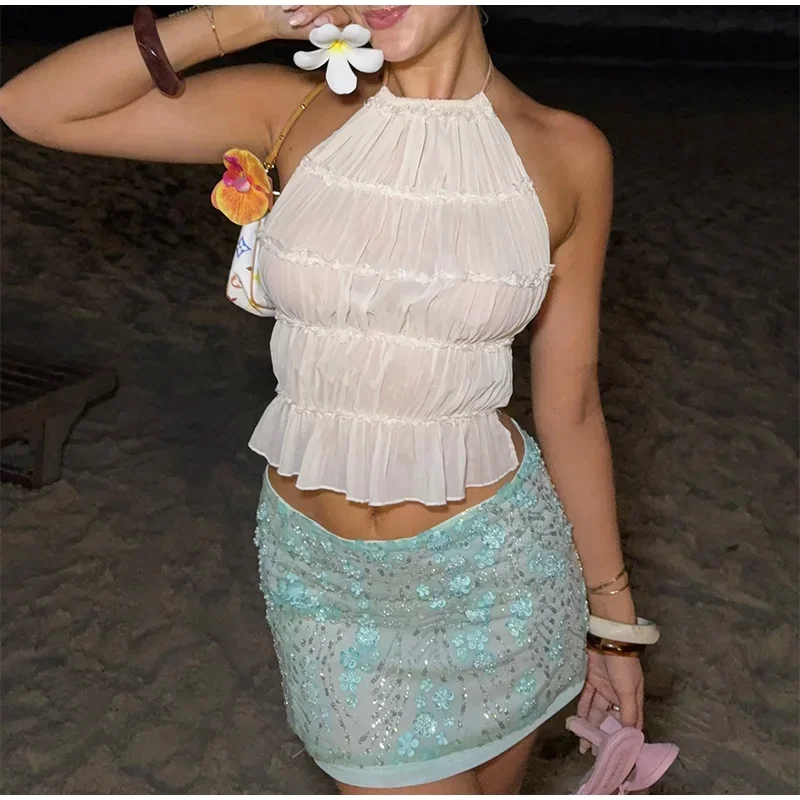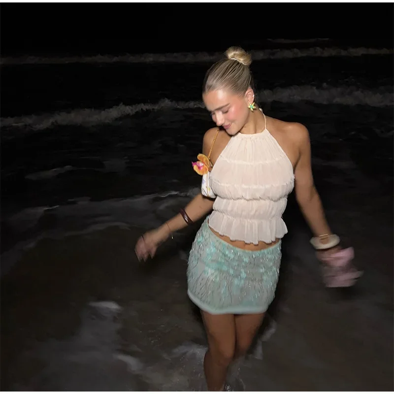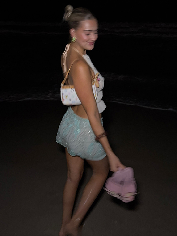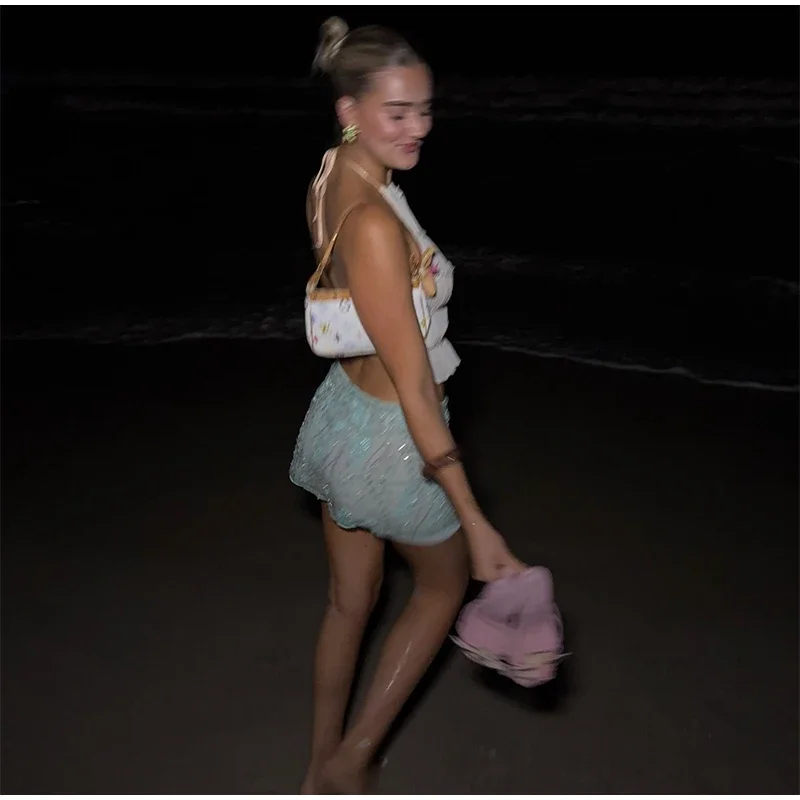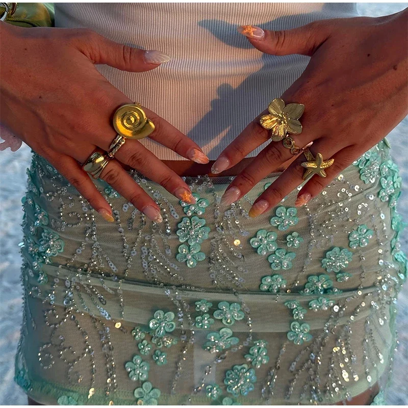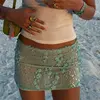 Sequin 3d Flower Beaded Mini Skirts Women Y2K Bodycon Shiny Party Skirt Female 2025 Summer Lady Sexy All-match Beach Outwear