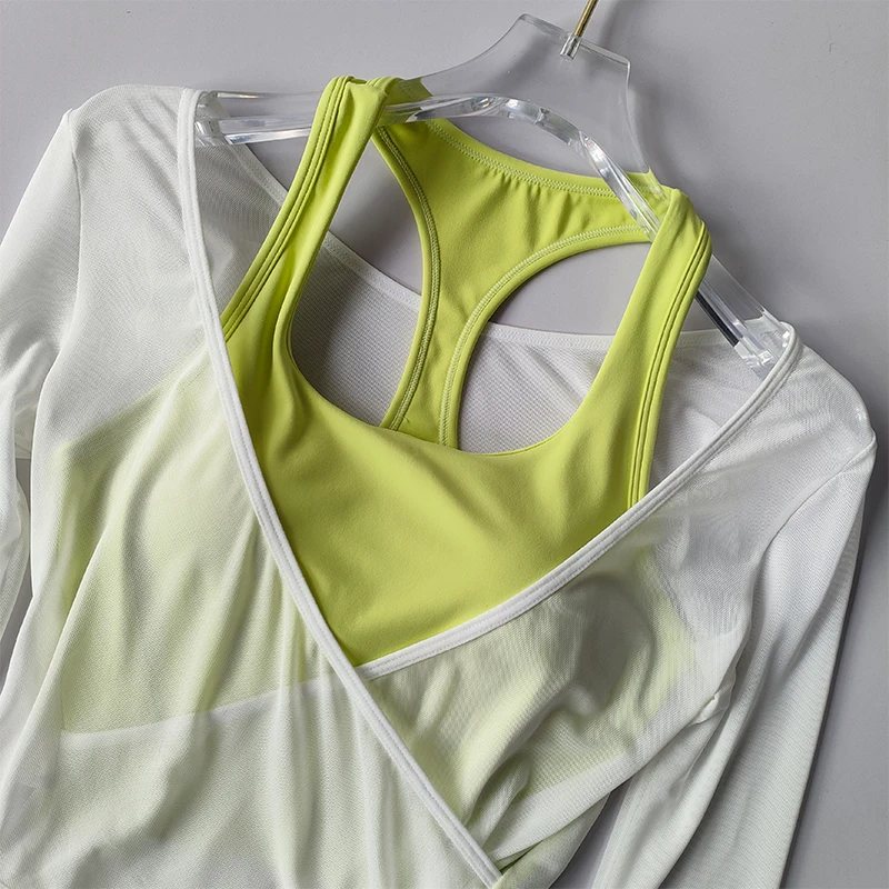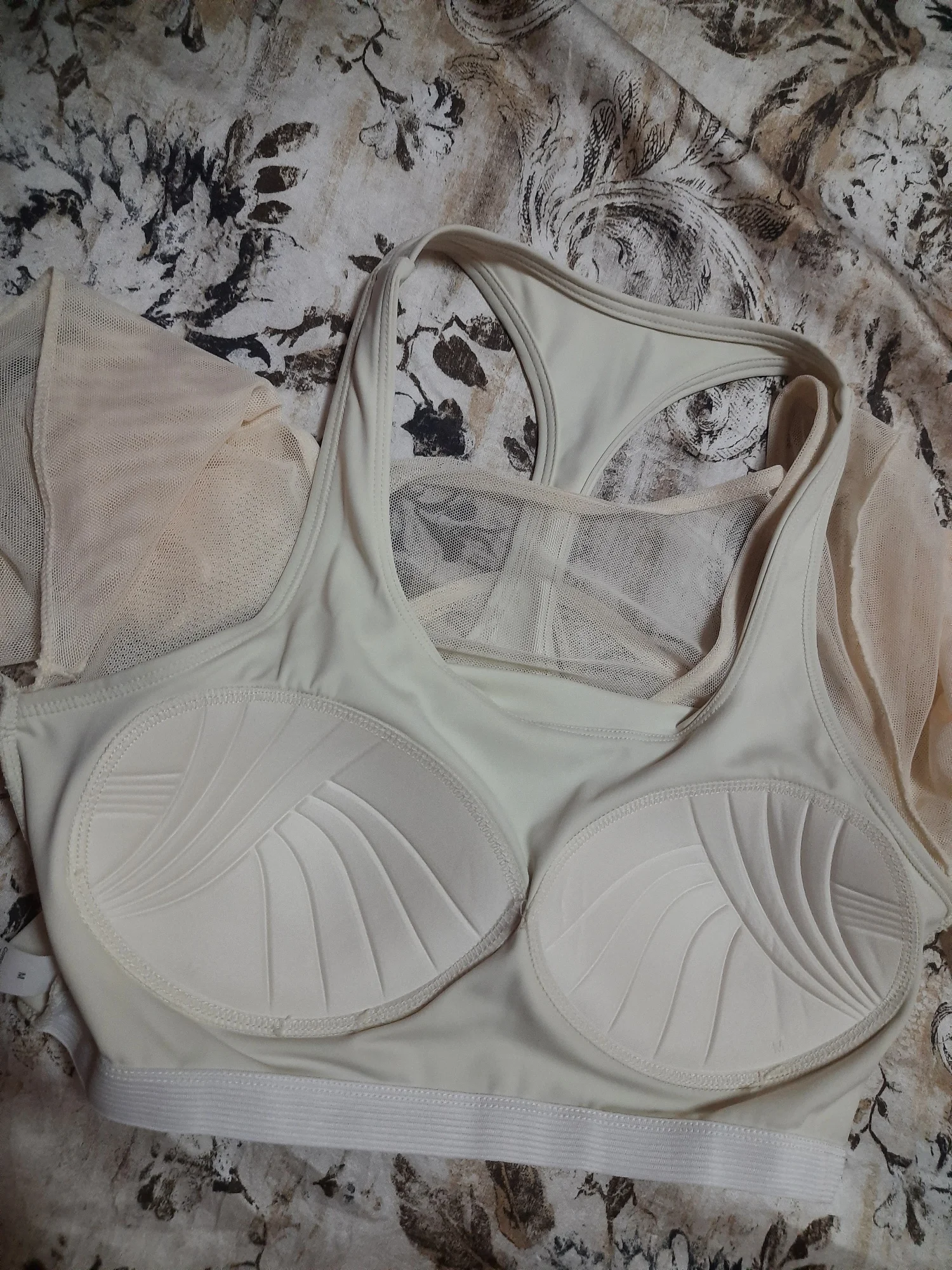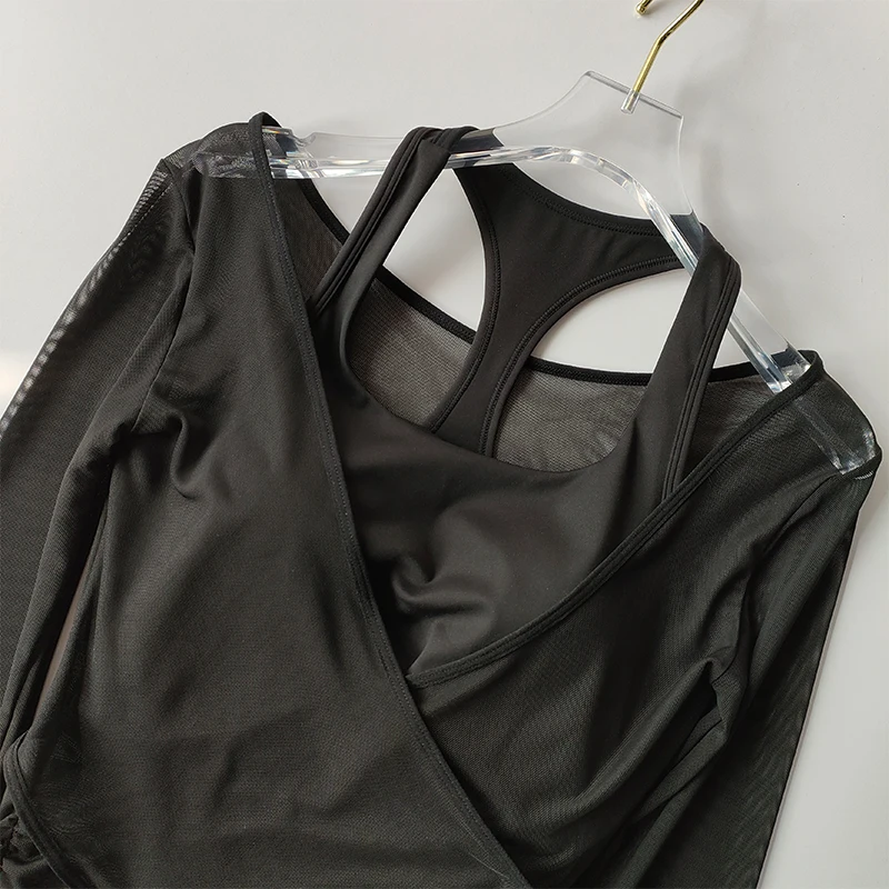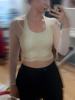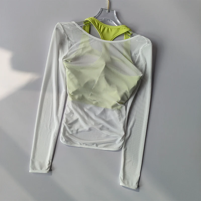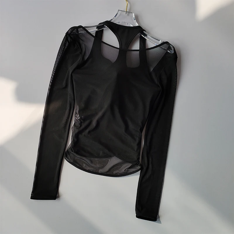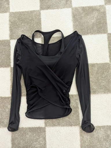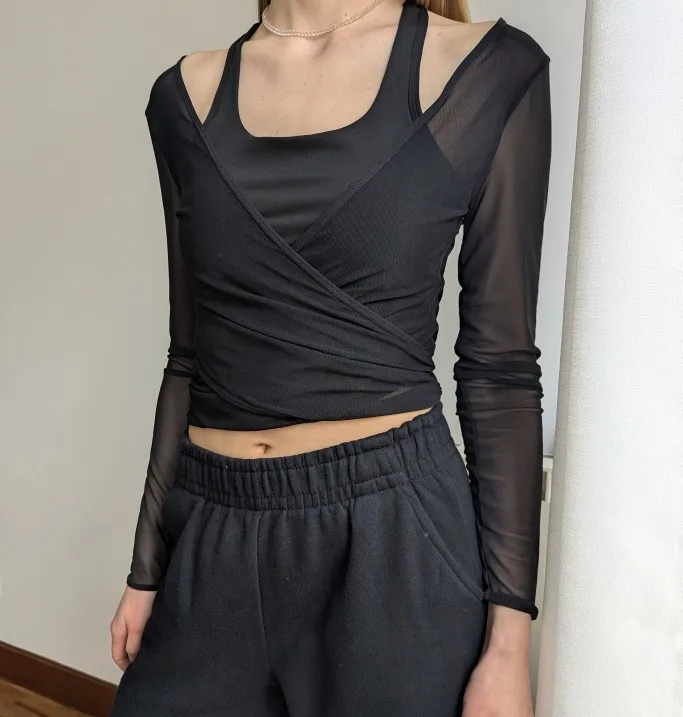 I really liked this top, the cups are not see-through, the quality is good, and it feels nice on the body. The only issue is that the mesh slightly rises at the bottom, but it's not a big deal at all. The dance training also went well, nothing restricted movement, didn't ride up, thumbs up. The only thing is that every time I get confused on how to wear it :D.