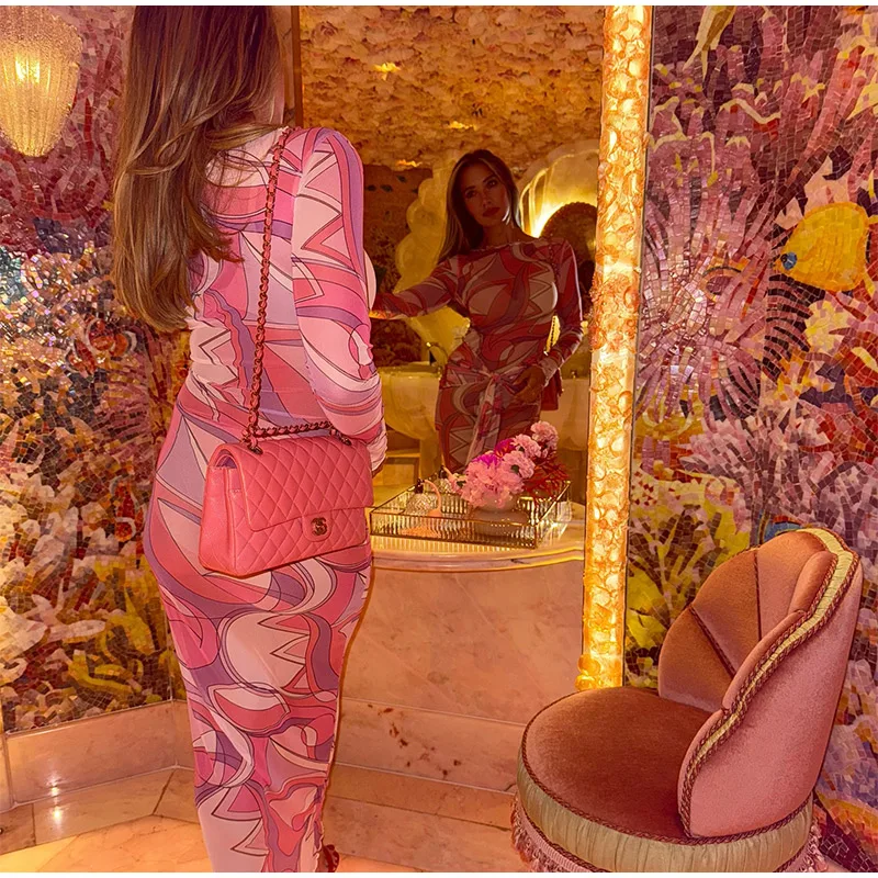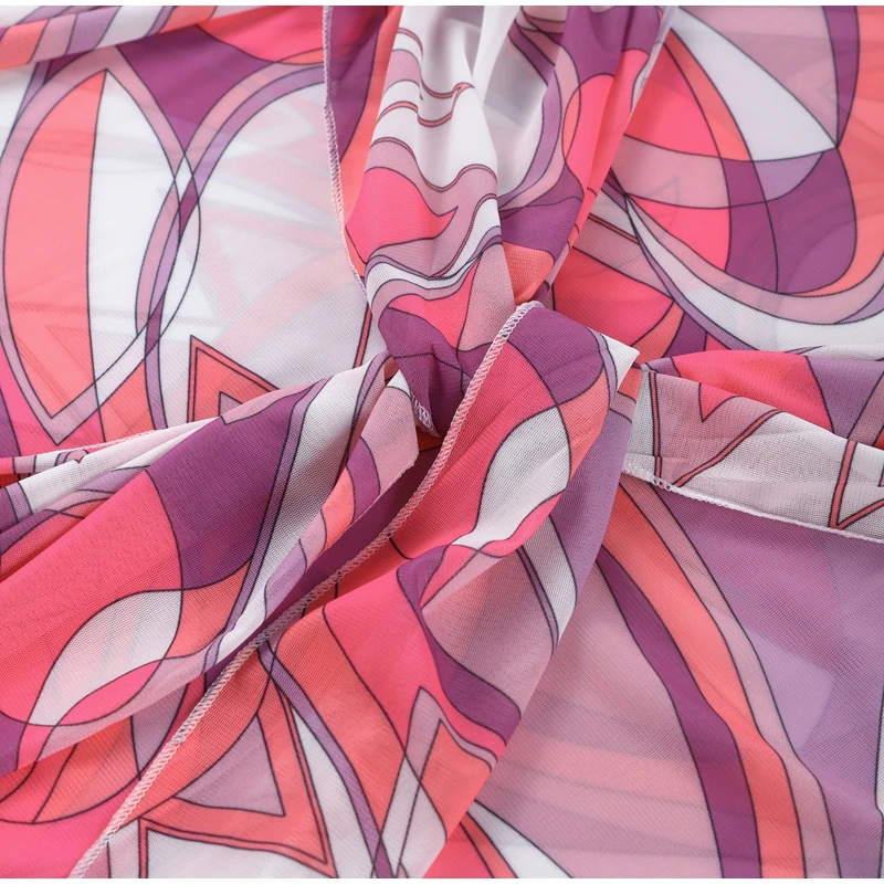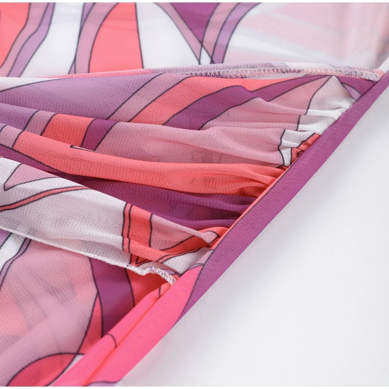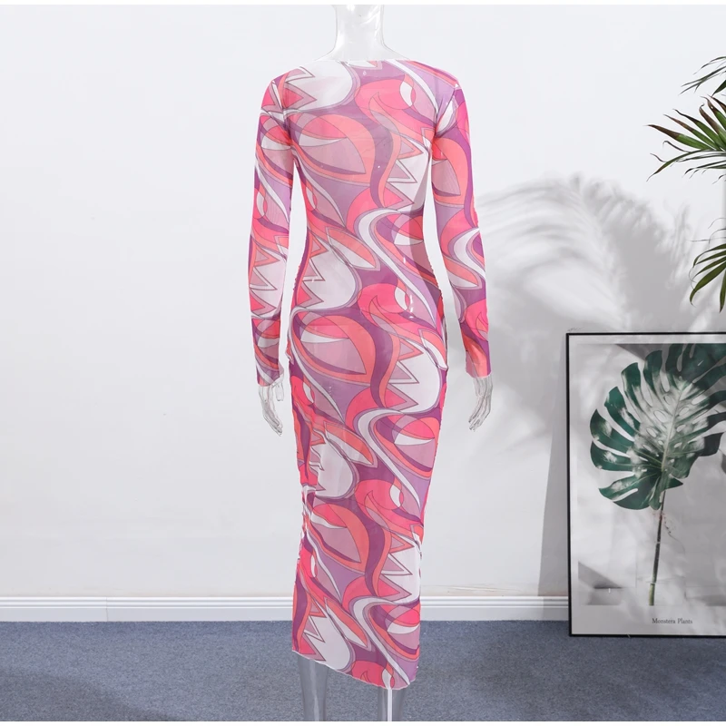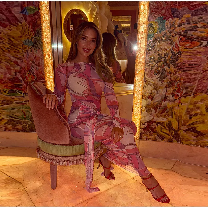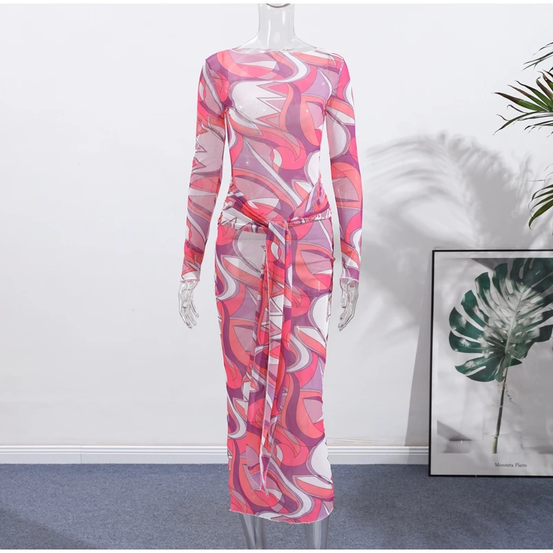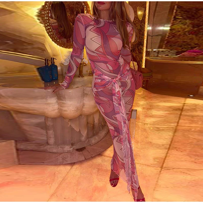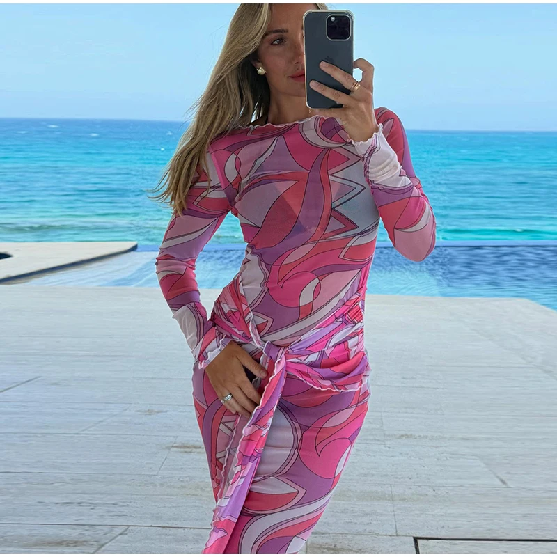 Sexy Slim Colorful Print Long Dress Women O-neck Full Sleeve Hip Package Knot Dresses 2025 Summer Autumn Beach Vacation Robes